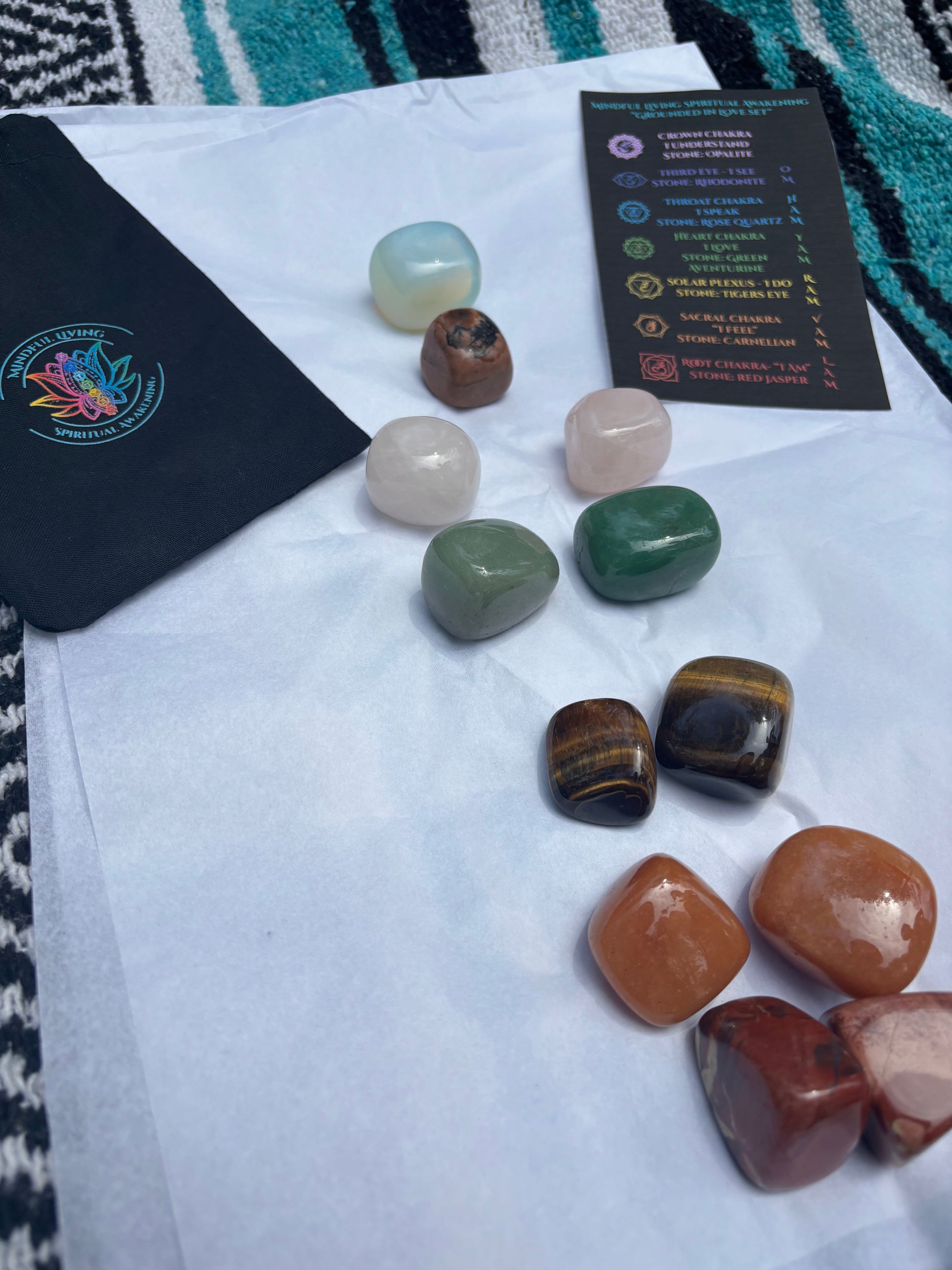 "Grounded in Love Chakra stone set- This chakra stone set is curated with a focus on Love and Grounding. It comes with Twelve 2-3cm stones as set is designed to be used for our Meditation Hoodie so there is one stone for each pocket on Hoodie- 1 for the crown, 1 for third eye and 2 for each of the other 5 chakra. Image of specific stones is included and a video introduction to this stone set is below
