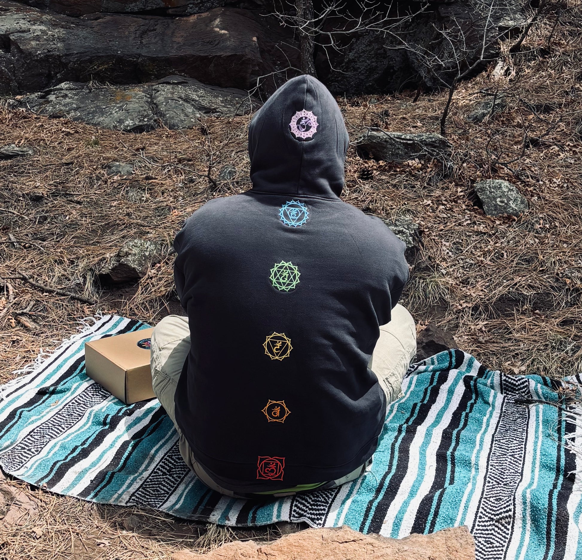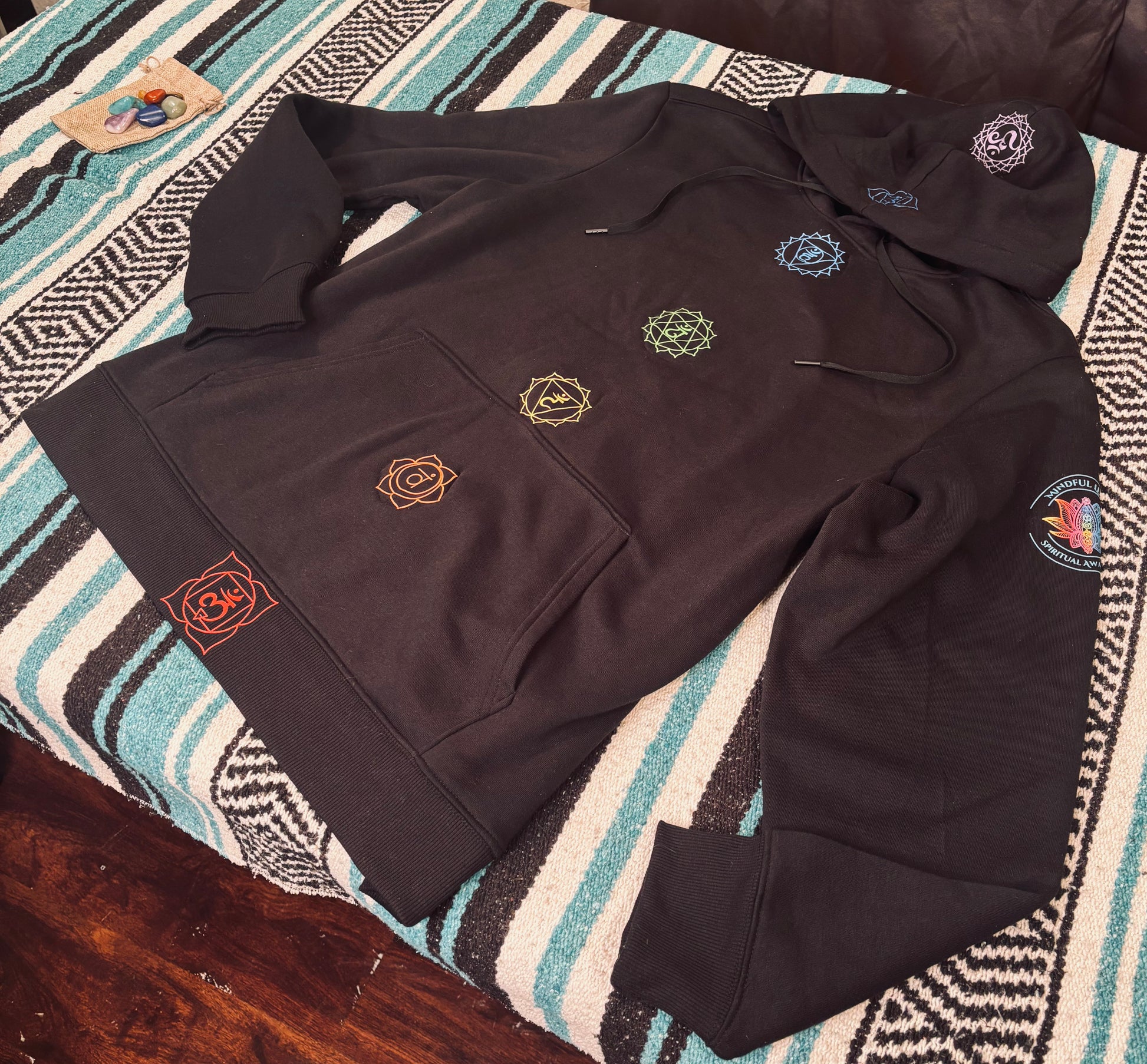 The Ultimate Meditation Companion. One of a kind meditation hoodie with custom pockets at each chakra point so that you can put your chakra stones in them and have resonance and flow during meditation.
